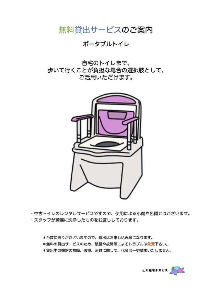 *当院の貸出用ポータブルトイレは、担当させていただいたご家族様が寄付して下さったものです。改めて心より御礼申し上げます。