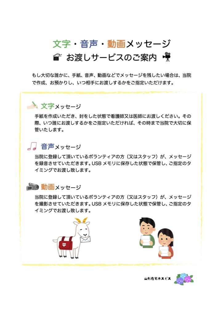 もし大切な誰かに、手紙、音声、動画などでメッセージを残したい場合は、当院 で作成、お預かりし、いつ相手にお渡しするかをご指定いただけます。